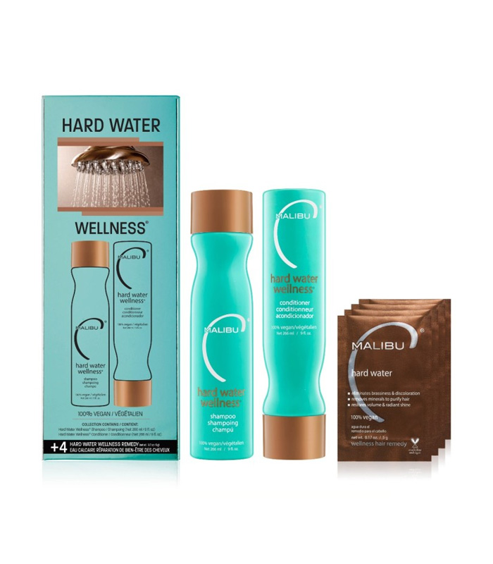 Malibu C Hard Water Collection Kit er et hårpleiesett som fjerner mineraler og misfarginger som kan være forårsaket av hardt vann. Sjampoen gir håret tekstur og beskytter mot elementene som finnes i hardt og mykt vann som kan tørke ut og misfarge håret. Balsamen gir håret glans og gjør det lettere å filtre. Hard Water Treatment (de fire små posene) fjerner kalsiumavleiringer i håret, forhindrer misfarging og gjør håret mykt.